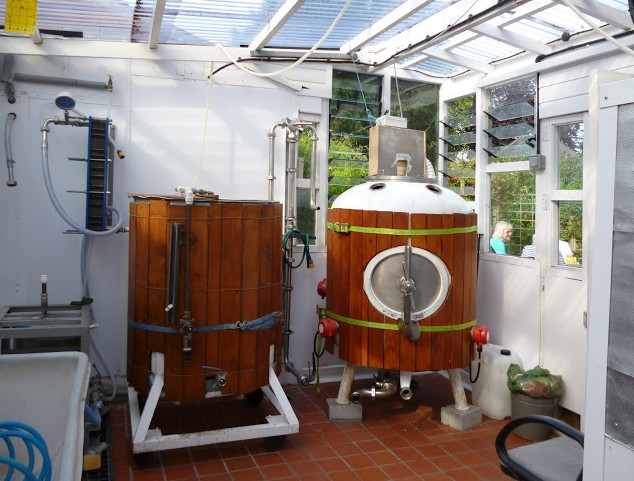 On the right is the copper and on the left is a mash tun which can be trundled around. In the far corner is the spray head of the cask washer and a heat exchanger is mounted on the wall. | |