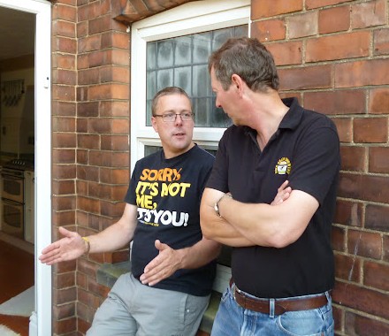 It's not often that two rural brewers get a chance to chat: Denzil Vallance of Great Heck compares notes with Phil |