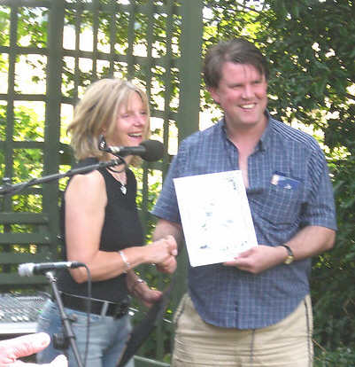 Brewster Sue Simpson receives a framed certificate from debonair Hugh Grant lookalike, Mark Goodair, chairman of Wakefield CAMRA. The certificate features CAMRA's Bill Tidy cartoon character Keg Buster. |