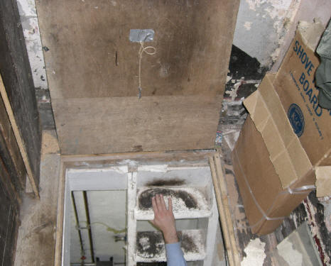 There is a dim passage at the side with a sign revealed only by the flash of the camera. |