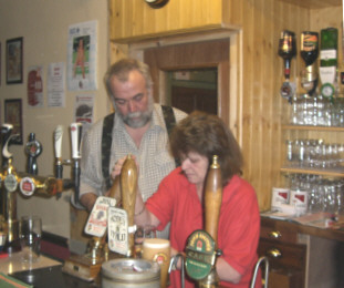There's always a rapid turnover of Dark Tribe brews on the bar of the Dog & Gun, which draws in many folk from the surrounding villages who are wanting a pint not food! Dixie's wife Judy is here seen pulling on Dixie's Bollards. |