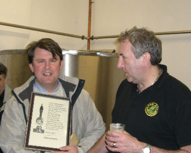 presentation of commemorative certificate to brewer Jess McConnell by Wakefield CAMRA Chairman Mark Goodair |