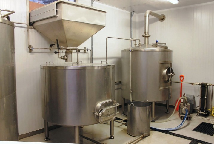 Brewing vessels, left to right, hot liquor tank, mash tun with grist hopper above, hop back and kettle. |