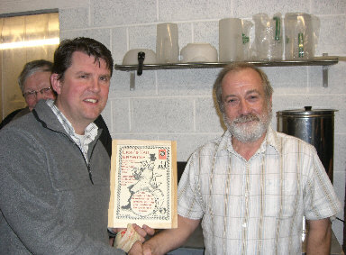 Wakefield CAMRA Chairman Mark Goodair presents a certificate to mark the visit. Tragedy struck a little earlier as the coach lurched along the twisting roads to Cheswardine, as the glass of the frame shattered. However, Jon also received an unbroken tankard from Wakefield's 2007 Merrie City Beer Festival ! |