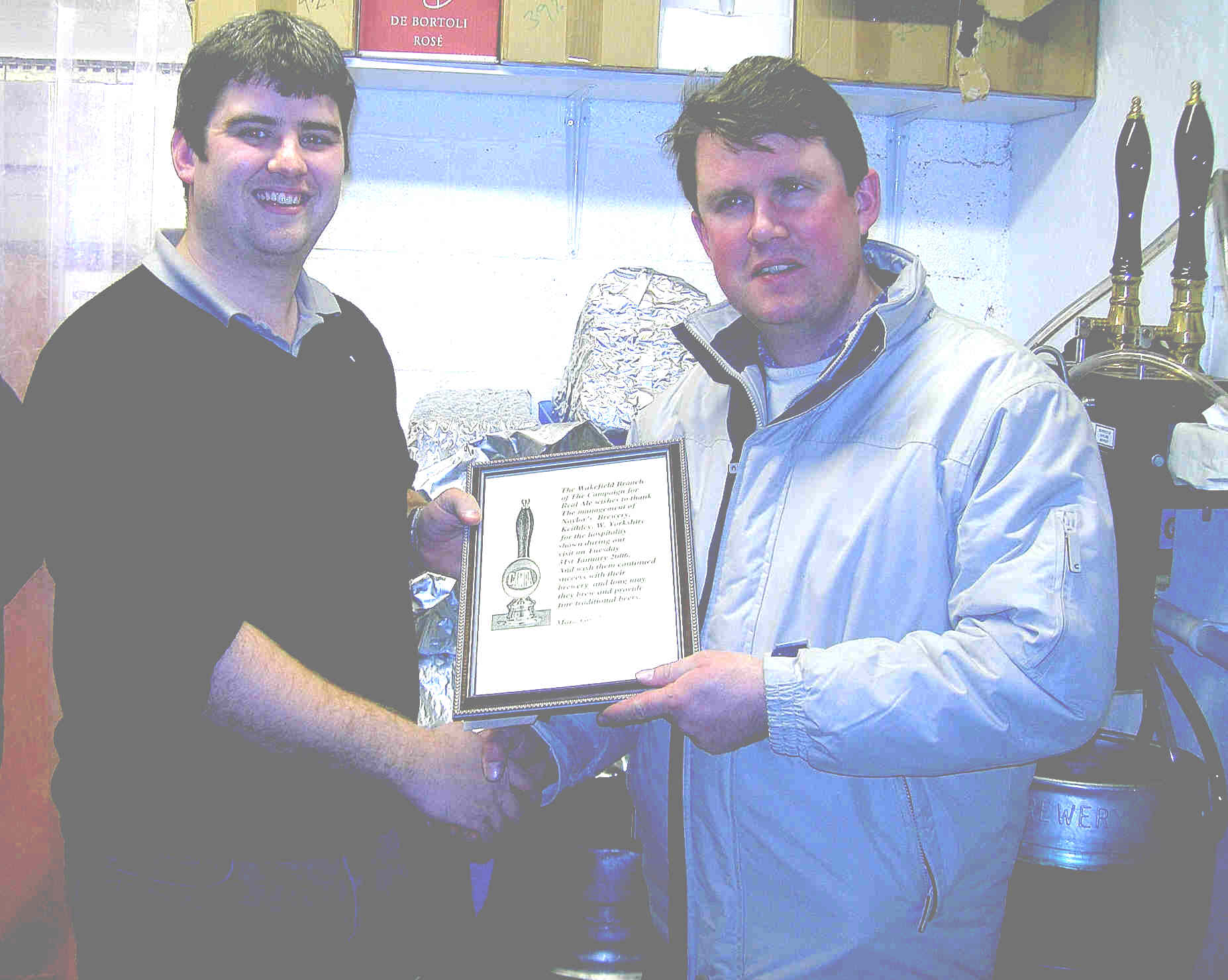 A framed certificate is presented by Wakefield Chairman, Mark Goodair, to brewer Robert Naylor.