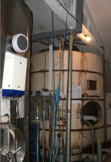 The kettle was one of the many ex-dairy vessels and never intended to be used for boiling. The remarkably efficient heating is provided by an adaptation of a large central heating furnace. The interior is shown on the web album. |